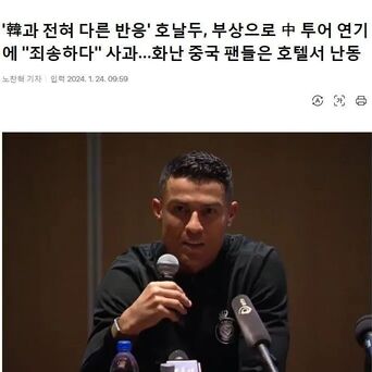 【韩媒将C罗在中国与对韩国态度对比】1月23日,利雅得胜利赛事主办方表示,因C罗受伤无法上场比赛,原定于24日和28日两场比赛延期举行。C罗在发布会现场表示:“对我来说,今天是很难过的一天。我要向中国球迷道歉,我爱中国,我想为你们踢球。”